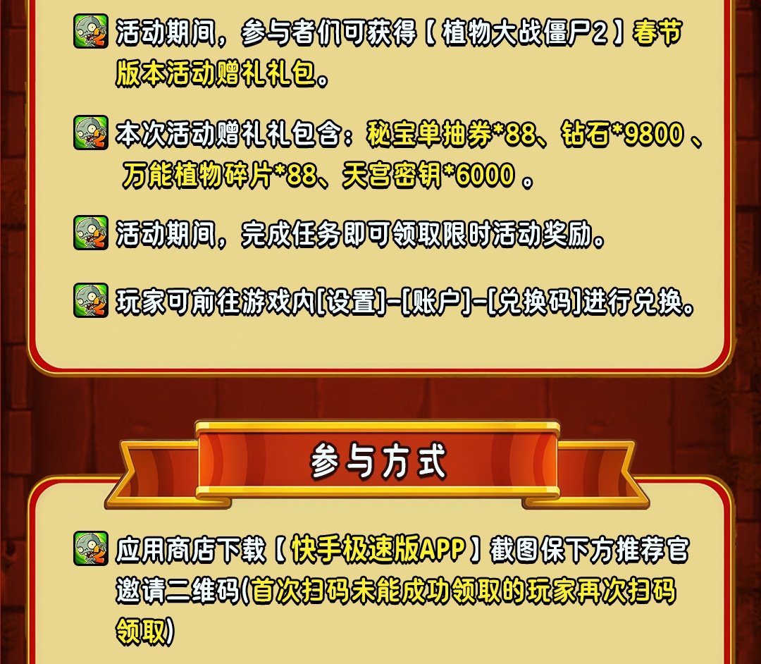 领取失败:请完成以下任务再领取 礼包内含:【秘宝单抽券*88 钻石*9800 万能植物碎片*88 天宫密钥*6000】